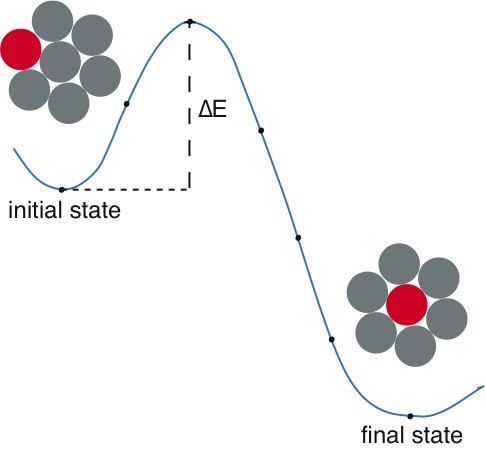After using several tools to theoretically investigate the properties of materials, I came to know that Nudged Elastic Band (NEB) method is highly resourceful tool to study the physics and chemistry of materials since it helps to calculate the rate of reactions, transition state, and reaction barriers etc. The application of this technique helps studying the potential energy surfaces, stages of reaction by monitoring the reaction parameters in very simple and efficient way. This is advance form of basic, chain of states or method of images in which different intermediate images (structures of intermediate reaction determine the minimum energy path between two predetermined minimized energy states such as shown in figure.